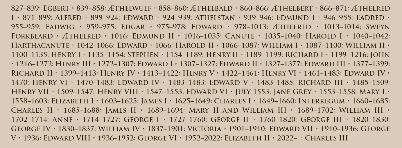 As I began writing my novel about American history (two years ago—still writing), I compiled a list of English monarchs that was both descriptive and concise to keep track of dates and people. I then expanded the list back to Egbert, and then to pre-history, because why not?
