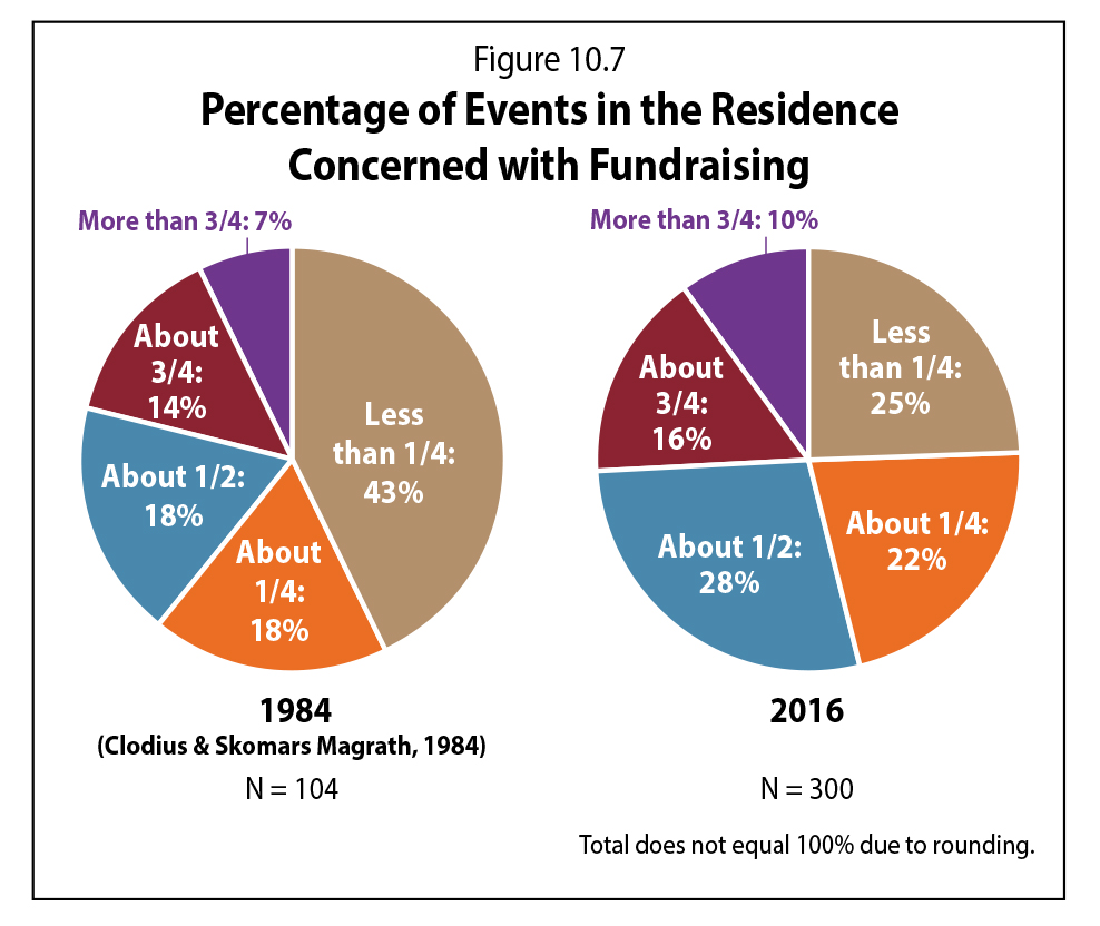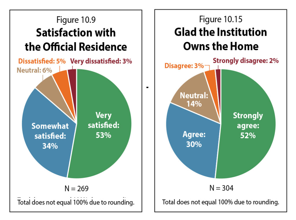 We discovered that over ninety percent of the AAU institutions have official residences for their leaders. Some institutions have more than one house, with houses, for example, for both campus heads and system heads, or one house for entertaining and a newer home where the leader lives. Of the fourteen major research universities in the Big 10 conference (which is both an academic and athletic conference), all of the institutions have presidential residences, some have more than one house. (The University of Illinois currently has a home for the president in Urbana-Champaign, and is building a new home for the chancellor. The University of Wisconsin has homes for both the president and the chancellor in Madison.)