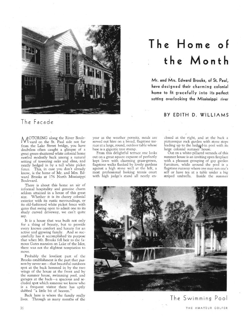 “Motoring along the River Boulevard on the St. Paul side not far from the Lake Street bridge, you have doubtless often caught a glimpse of a great green-shuttered white colonial home nestled modestly back among a natural setting of towering oaks and elms, and neatly hedged in by a tall white picket fence. This, in case you don’t already know, is the home of Mr. and Mrs. Edward Brooks at 176 North Mississippi Boulevard.”
