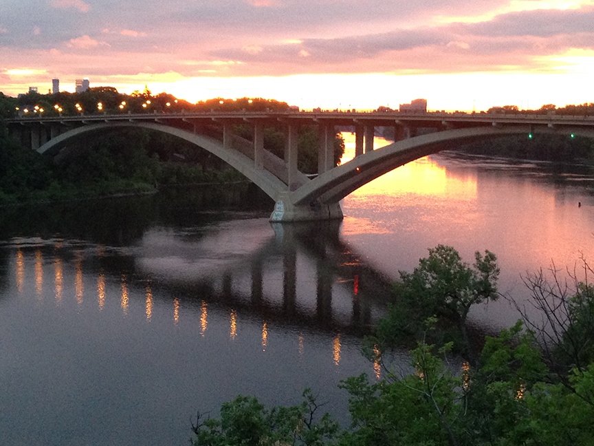 In 1989, construction was begun on a four-lane replacement bridge next to the old bridge. The old bridge was demolished and the new bridge completed in 1992. The bridge was dedicated on June 25, 1991, as the Sri Chinmoy Peace Bridge—although I have never heard it called that. A sign on the Minneapolis side of the bridge reads: