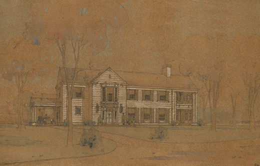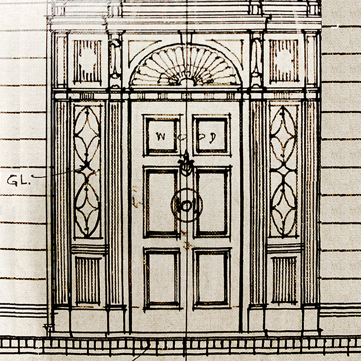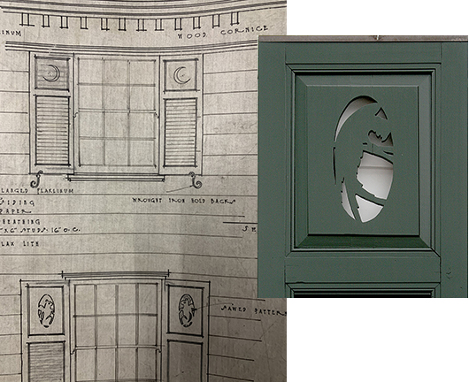 I read of a “cut-out shutter craze” in 1920s colonial revival houses. It was the thing. Johnston’s architectural drawings include the parrot on all the lower shutters, as well as a crescent moon on the second story windows, and a detail drawing of a shutter with a squirrel. It seems to me that the architect made suggestions, and the Brooks chose option one (the parrot) rather than option two (the squirrel), and nixed the crescent moons completely.
