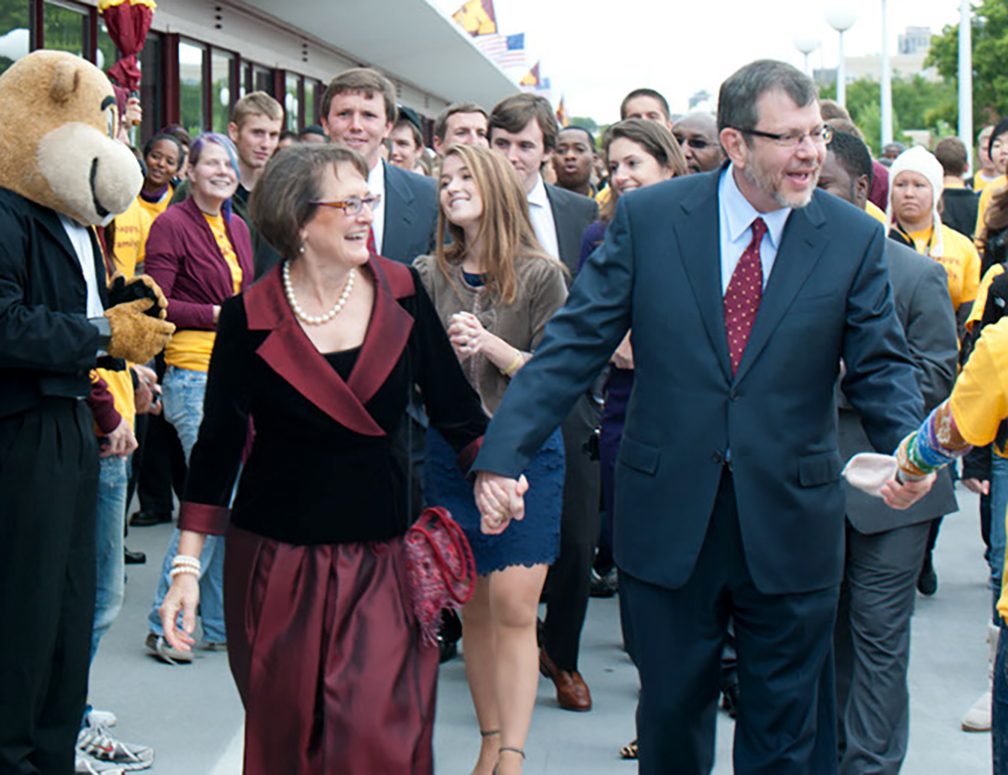 Sam Kaler and Lizzy Shay met on September 22, 2011, minutes after Eric Kaler’s inauguration as the sixteenth president of the University of Minnesota. They were photographed together that day (photo courtesy of the University of Minnesota; second row: Sam Kaler, Lizzy Shay, Charlie Kaler, Lisa Smith). A similar photograph taken by another photographer appeared on the front page of the newspaper the following day.