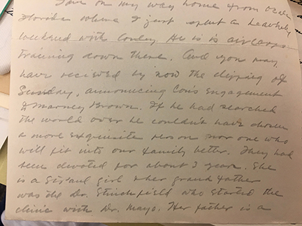 Conley Brooks and Marney Brown married on March 18, 1944, with a dinner the night before at Eastcliff. Future mother-in-law Markell wrote to her cousin Quail Hawken regarding her eldest son’s engagement: