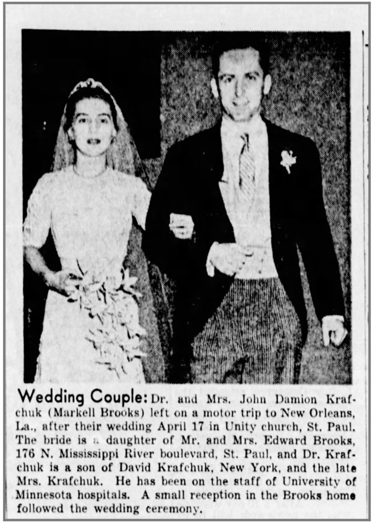 Binky Brooks and John Krafchuk married on April 18, 1954, at Unity church followed by a reception at Eastcliff. Marney Brooks was the matron of honor, and Marney and Conley’s daughter, Marlow, was a flower girl, along with the groom’s niece.