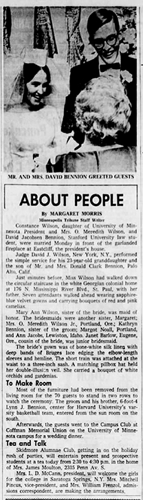 Connie Wilson married David Bennion married on December 27, 1965, in the Eastcliff living room, followed by a reception at the Campus Club.