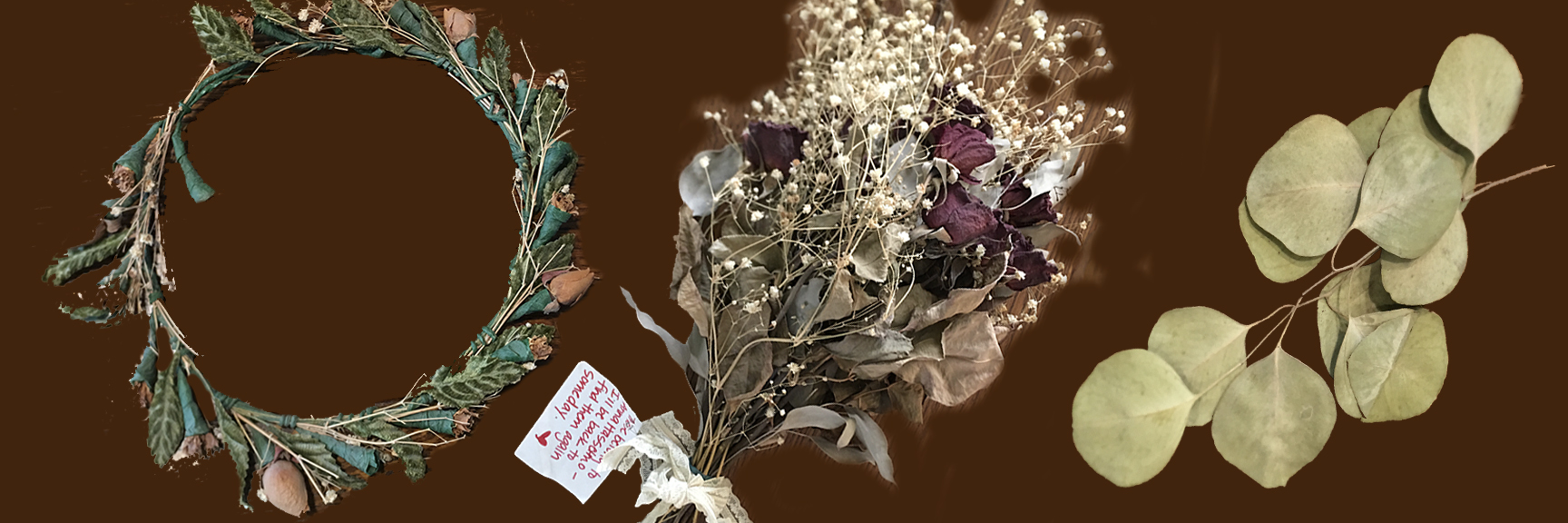 Right: A piece of Diane Magrath’s wedding wreath, preserved in the Eastcliff secret cupboard