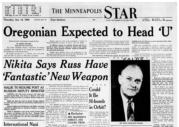 Left: Newly elected University of Minnesota President O. Meredith Wilson, 1960 (Source: University of Minnesota Archives); Right: Star, January 20, 1960