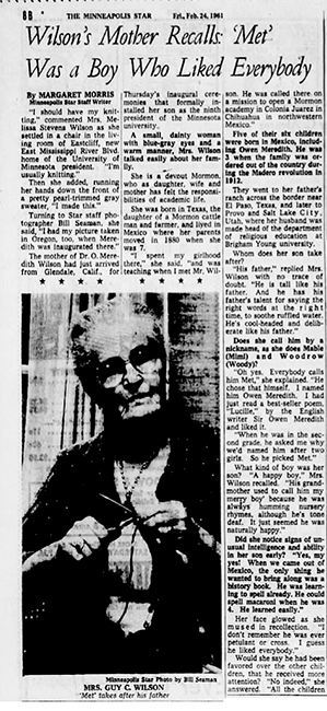 Newspaper clipping from the Minneapolis Star, February 24, 1961 (Margaret Morris, “Wilson’s Mother Recalls: ‘Met’ Was a Boy Who Liked Everybody”)
