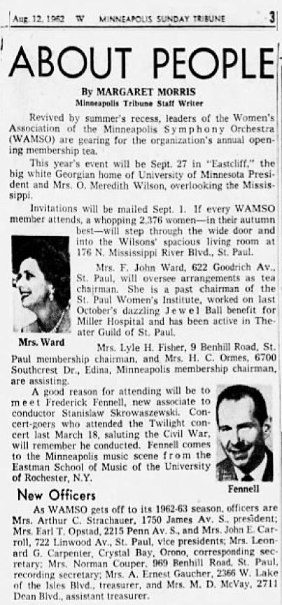 An August, 1962, newspaper article mentioned an event to be held at Eastcliff for the Women’s Association of the Minneapolis Symphony Orchestra (WAMSO) with 2,376 women invited. The Wilsons hosted and attended many events, as have all university presidential couples.