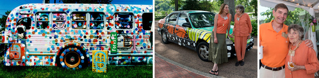 Center: Tracy Moos with a friend (and her car) at the Friends of Eastcliff Garden Party in 2015, when the theme was monarch butterflies;
