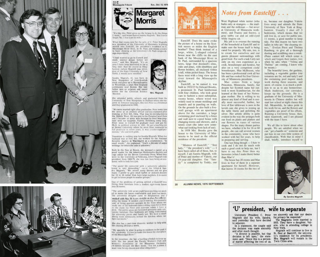Left to right: top photo: Peter (left), unknown (center) and Sandra Magrath (right); bottom photo: Sandra, Peter, and Valerie Magrath (both photos from the University of Minnesota Archives), Minneapolis Tribune, October 13, 1974; Sandra Magrath’s column “Notes from Eastcliff”, Minnesota Alumni News, September 1976; The Minneapolis Star, April 25, 1977.