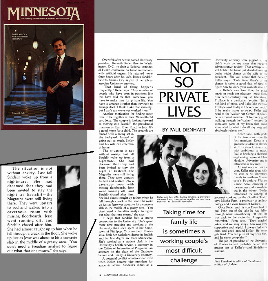 Diane’s professionalism and salary (paid to her by her husband from his salary) would later gain national attention and newspaper stories when the couple worked at the University of Missouri. Before that notoriety, in Minnesota in 1981 Diane used interest in her paid arrangement to explain how the previous eleven partners to the university president had served the university, receiving press coverage in an article titled “Diane Magrath continues a university tradition as partner of president.”