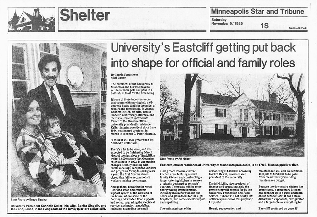 When Ken Keller was named as president of the University in 1985, Minnesota magazine ran a special issue. In an article on Ken and Bonita, Bonita shared a prescient nightmare she had about a disaster at Eastcliff. In November of that year, the much-needed ongoing remodel of the house was described on the first page of the “Shelter” section of the Star and Tribune.
