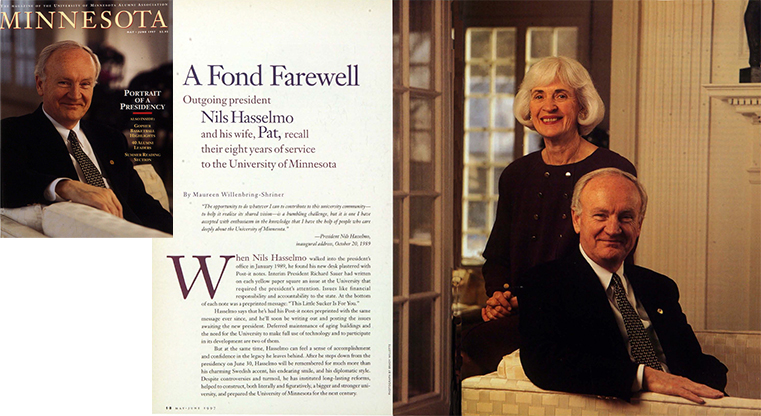 Malcolm Moos was the first Minnesota native and the first University alumnus to serve as president. When he was hired as the tenth president of the University, the alumni magazine ran a profile article, quoting him as saying,