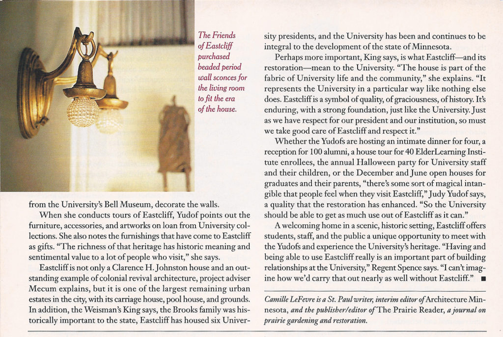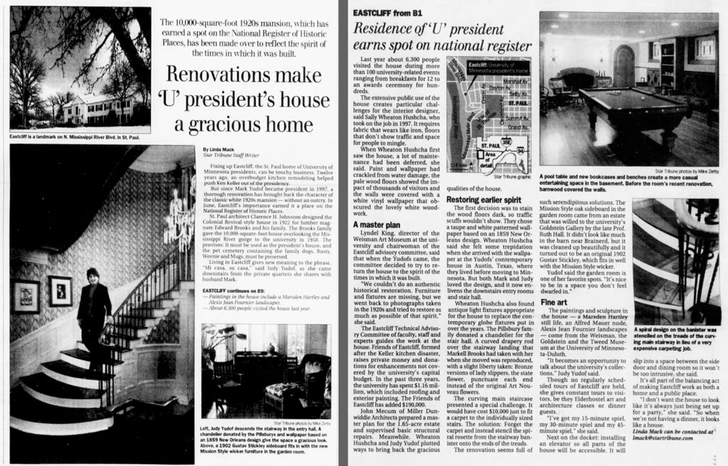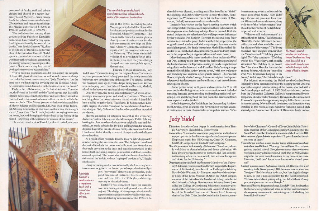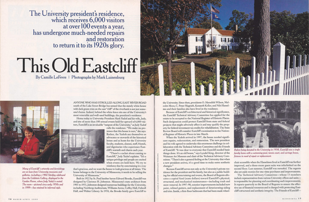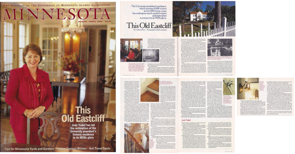 Judy Yudof and the Eastcliff redecoration were the feature story in Minnesota: The Magazine of the University of Minnesota Alumni Association, March–April 2000, with photographs by Mark Luinenburg.