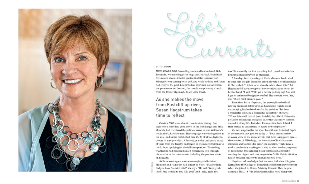 The Summer 2011 edition of Connect (magazine of the University of Minnesota College of Education and Human Development) had an article on Susan Hagstrum titled “Life’s Currents.” The article, celebrating her tenure as presidential partner, was listed on the cover as “Susan Hagstrum: A First Lady reflects.”
