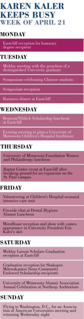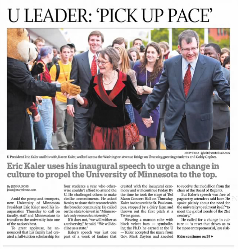 Another lovely story in the Minnesota Daily (May 6, 2014) was titled “The University’s No. 1 ambassador,” and began with the joke I liked to share about my Tennessee roots: “Karen Kaler is a naturalized Gopher.”