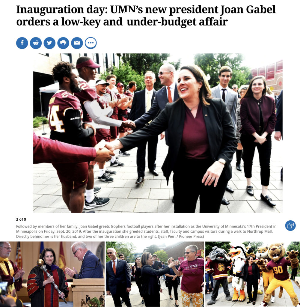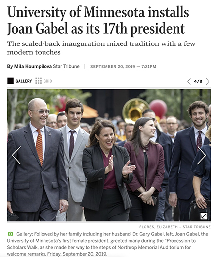 From the St. Paul Pioneer Press, September 21, 2019, at https://www.twincities.com/2019/09/20/umn-welcomes-president-joan-gabel-with-low-key-inauguration/
