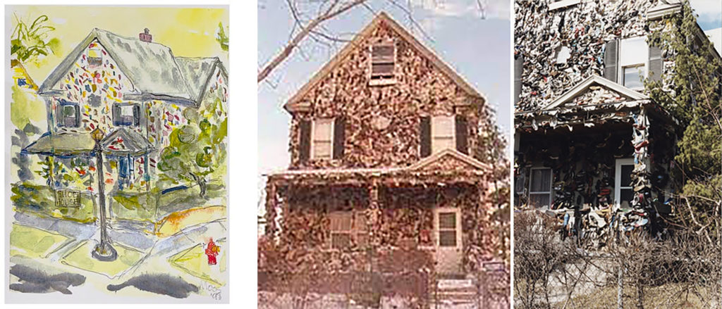 Left: Watercolor by Tracy Moos. See also: See also: https://www.gettyimages.com/detail/news-photo/the-shoe-house-is-for-sale-tracy-moos-hopes-the-new-owner-news-photo/1154268779?language=es