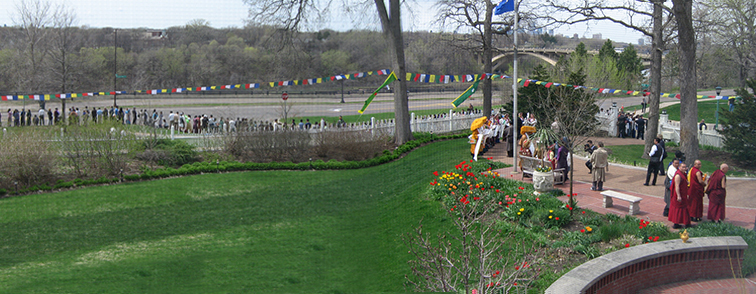 The ceremony began on the circular driveway with the burning of juniper, raising of flags, and a warrior cry. (Chairs were set for the elderly by the flagpole, and as needed along the way.) The entire group processed across the front yard to the southwest corner for Tashi Sholpa, a traditional Tibetan opera dance. Next, as a piper played from the southeast part of the yard, the group progressed to the backyard.