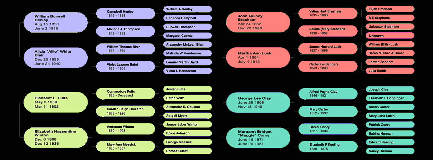 Over time, and with time-consuming double-checks, I built trees with many ancestors. A few of the links I quickly accepted I later discovered were false, and one or two I rejected as false I now believe are true.